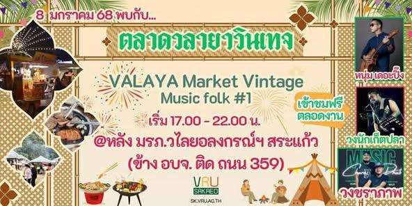 เปิดงาน”VALAYA Market Vintage Music Folk”ครั้ง 1 พร้อมด้วยหัวหน้าส่วนราชการ เจ้าหน้าที่กลุ่มส่งเสริมการประกอบธุรกิจการค้าและการตลาด และผู้ที่เกี่ยวข้องเข้าร่วมพิธีเปิดโครงการมหาวิทยาลัยเพื่อชุมชนสู่เศรษฐกิจสร้างสรรค์ “VALAYA Market Vintage Music Folk” ครั้งที่ 1 ณ ศูนย์การเรียนรู้ศาสตร์พระราชา มหาวิทยาลัยราชภัฏวไลยอลงกรณ์ ในพระบรมราชูปถัมภ์ หมู่ที่ 2 ตำบลท่าเกษม อำเภอเมืองสระแก้ว จังหวัดสระแก้ว โครงการฯ ดังกล่าว มีวัตถุประสงค์เพื่อส่งเสริมเศรษฐกิจชุมชนเมืองสระแก้วอย่างสร้างสรรค์ เปิดโอกาสสร้างความสามารถทางการตลาด เปิดพื้นที่การแสดงออกของเด็กและเยาวชน และเปิดพื้นที่สร้างสรรค์ด้านดนตรีและศิลปวัฒนธรรมอย่างต่อเนื่อง นำไปสู่การเกิดประโยชน์สูงสุดในภาคธุรกิจของกลุ่มผู้ประกอบการจังหวัดสระแก้วจัดโดย มหาวิทยาลัยราชภัฏวไลยอลงกรณ์ ในพระราชูประถัมภ์ สระแก้ว