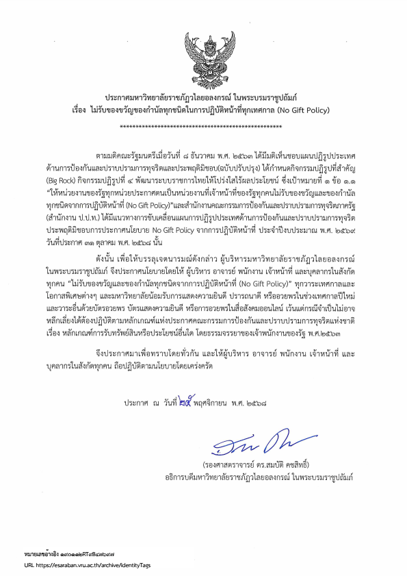 ประกาศนโยบาย “No Gift Policy” ประจำปีงบประมาณ ๒๕๖๙