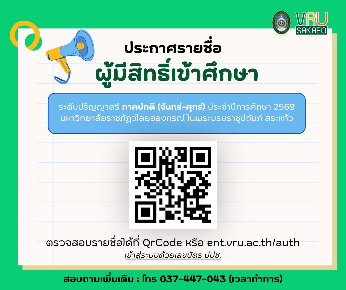 📢 ประกาศรายชื่อผู้มีสิทธิ์เข้าศึกษาต่อ มรวอ.สระแก้ว ประ