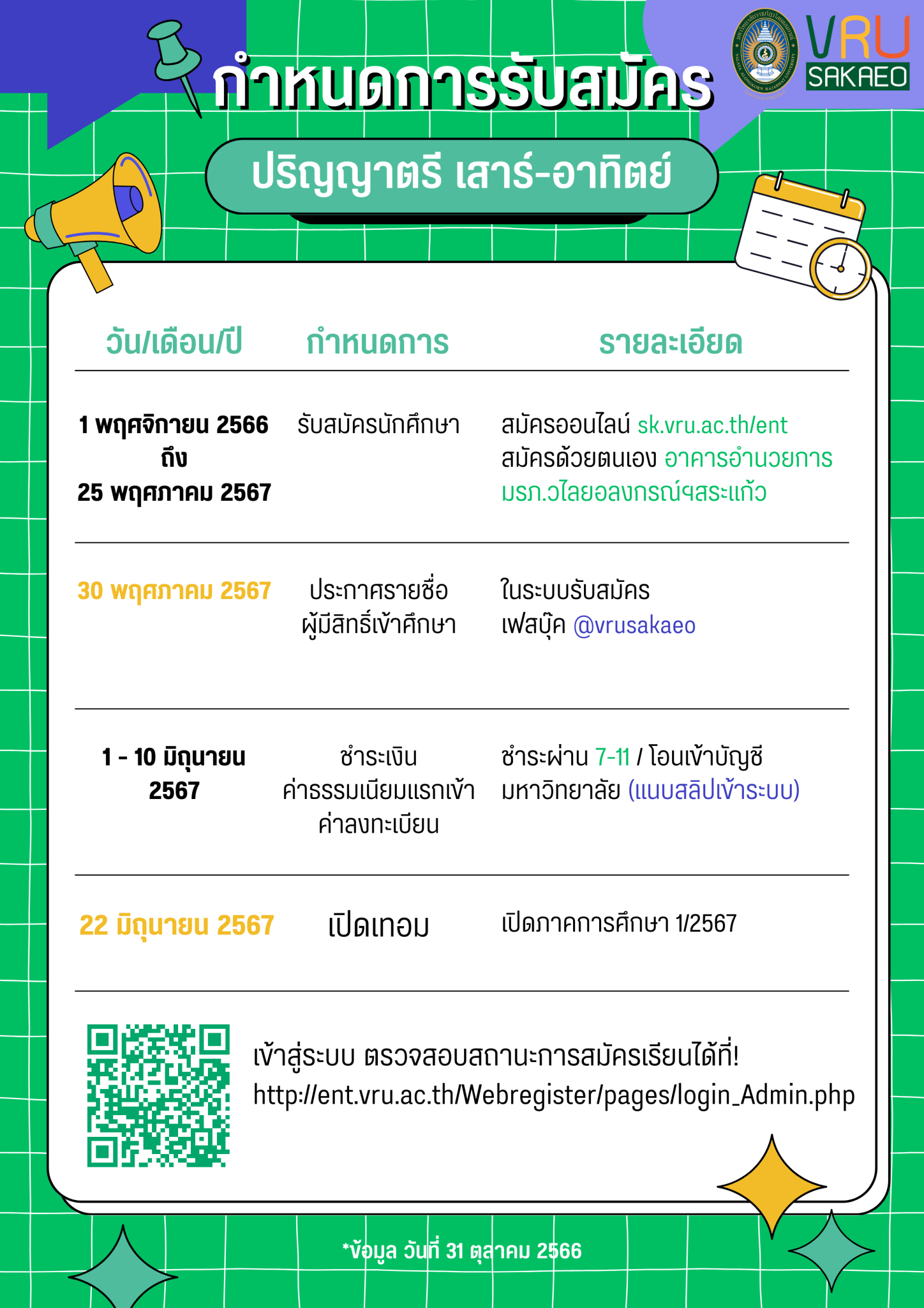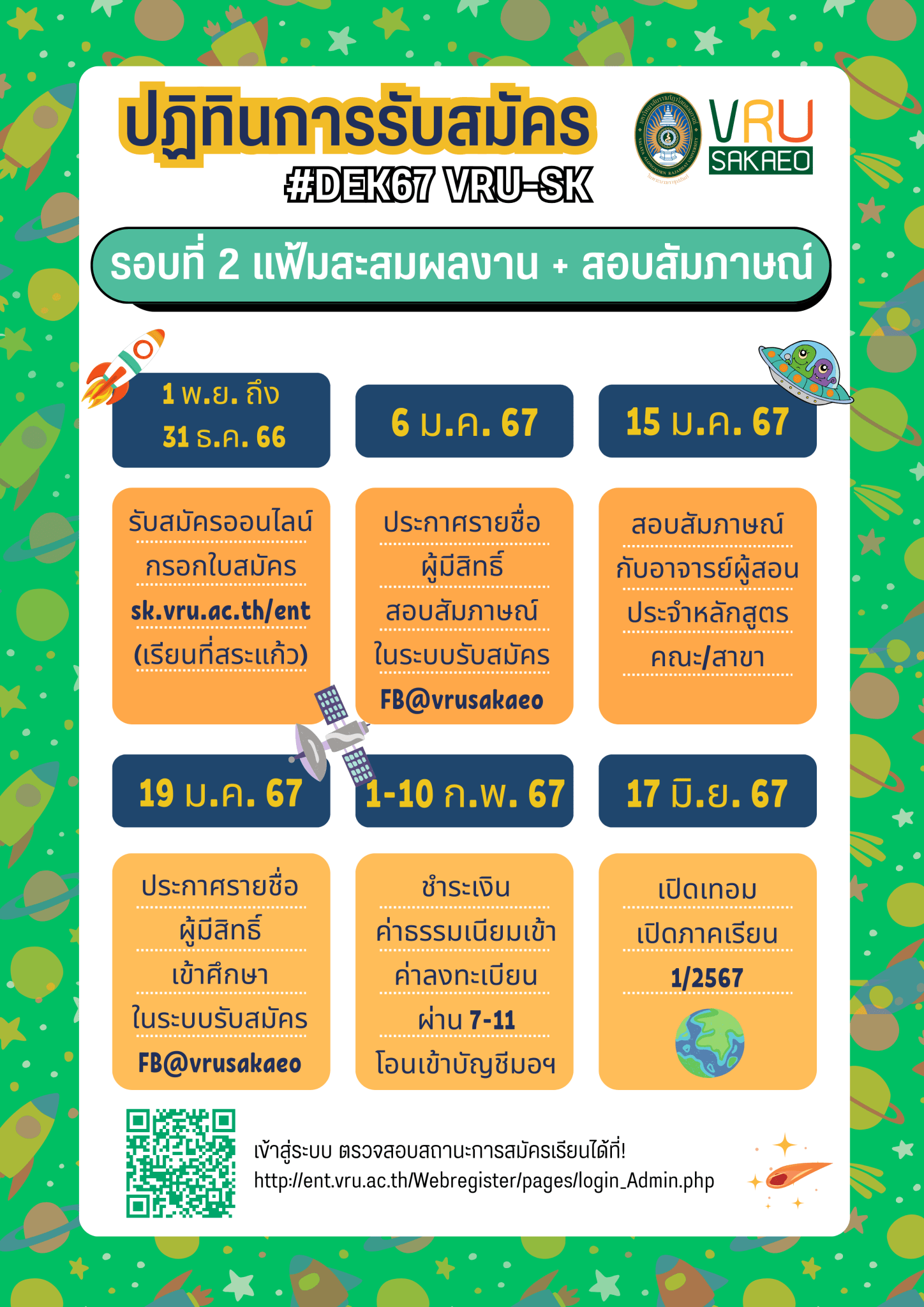 รับสมัครนักศึกษา 1 พฤศจิกายน 2566 ถึง 31 ธันวาคม 2566 สมัครออนไลน์ sk.vru.ac.th/ent ,สมัครด้วยตนเอง อาคารอำนวยการ มรภ.วไลยอลงกรณ์ฯสระแก้ว (ข้าง อบจ.) ประกาศรายชื่อผู้มีสิทธิ์สอบสัมภาษณ์ 6 มกราคม 2567 ประกาศในระบบรับสมัคร SIGN IN-VRU และเฟสบุ๊ค @vrusakaeo สอบสัมภาษณ์ 15 มกราคม 2567 ประกาศรายชื่อผู้มีสิทธิ์เข้าศึกษา 19 มกราคม 2567 ประกาศในระบบรับสมัคร SIGN IN-VRU และเฟสบุ๊ค @vrusakaeo ชำระเงินค่าธรรมเนียมแรกเข้า / ค่าลงทะเบียน 1 – 10 กุมภาพันธ์ 2567 ชำระผ่านเคาน์เตอร์ 7-11 หรือโอนเงินเข้าบัญชีของมหาวิทยาลัย (แนบสลิปการโอนเงินในระบบรับสมัครด้วย) เปิดเทอม เปิดภาคการศึกษา 1/2567 17 มิถุนายน 2567 เข้าสู่ระบบ ตรวจสอบสถานะการสมัครเรียนได้ที่! http://ent.vru.ac.th/Webregister/pages/login_Admin.php