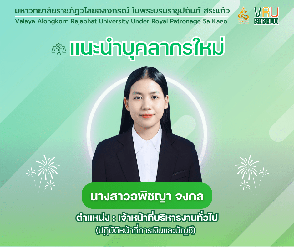 ขอต้อนรับบุคลากรใหม่สู่ครอบครัว VRU SAKEO มหาวิทยาลัยราชภัฏวไลยอลงกรณ์ ในพระบรมราชูปถัมภ์ สระแก้ว มีความยินดีที่จะแนะนำบุคลากรใหม่ นางสาวพิชญา จงกล ตำแหน่ง: เจ้าหน้าที่บริหารงานทั่วไป (ปฏิบัติหน้าที่การเงินและบัญชี)