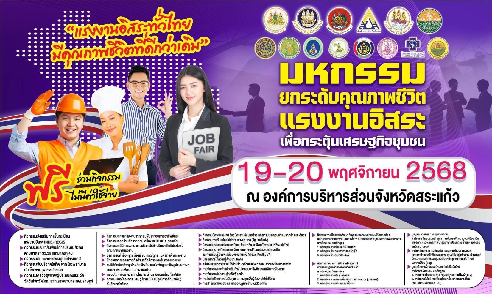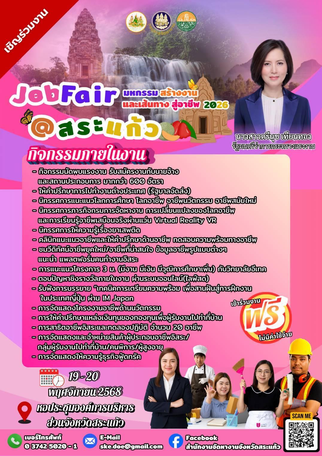 ห้ามพลาด! Job Fair & มหกรรมสร้างงาน และเส้นทาง สู่อาชีพ 2026 @สระแก้ว โอกาสทองของคนหางาน! ใครกำลังมองหางานดี ๆ หรืออยากอัพสกิลสร้างอาชีพใหม่ ต้องมางานนี้! วันที่ 19 – 20 พฤศจิกายน 2568 ณ หอประชุมองค์การบริหารส่วนจังหวัดสระแก้วข่าวประชาสัมพันธ์ / 8 พฤศจิกายน 2025 ห้ามพลาด! Job Fair & มหกรรมสร้างงาน และเส้นทาง สู่อาชีพ 2026 @สระแก้ว โอกาสทองของคนหางาน! ใครกำลังมองหางานดี ๆ หรืออยากอัพสกิลสร้างอาชีพใหม่ ต้องมางานนี้! วันที่ 19 – 20 พฤศจิกายน 2568 สถานที่ : หอประชุมองค์การบริหารส่วนจังหวัดสระแก้ว
