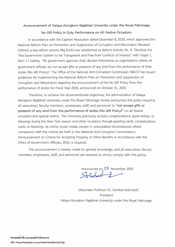 ประกาศนโยบาย “No Gift Policy” ประจำปีงบประมาณ ๒๕๖๙ข่าวประชาสัมพันธ์ ประกาศมหาวิทยาลัย | 11 ธันวาคม 2025