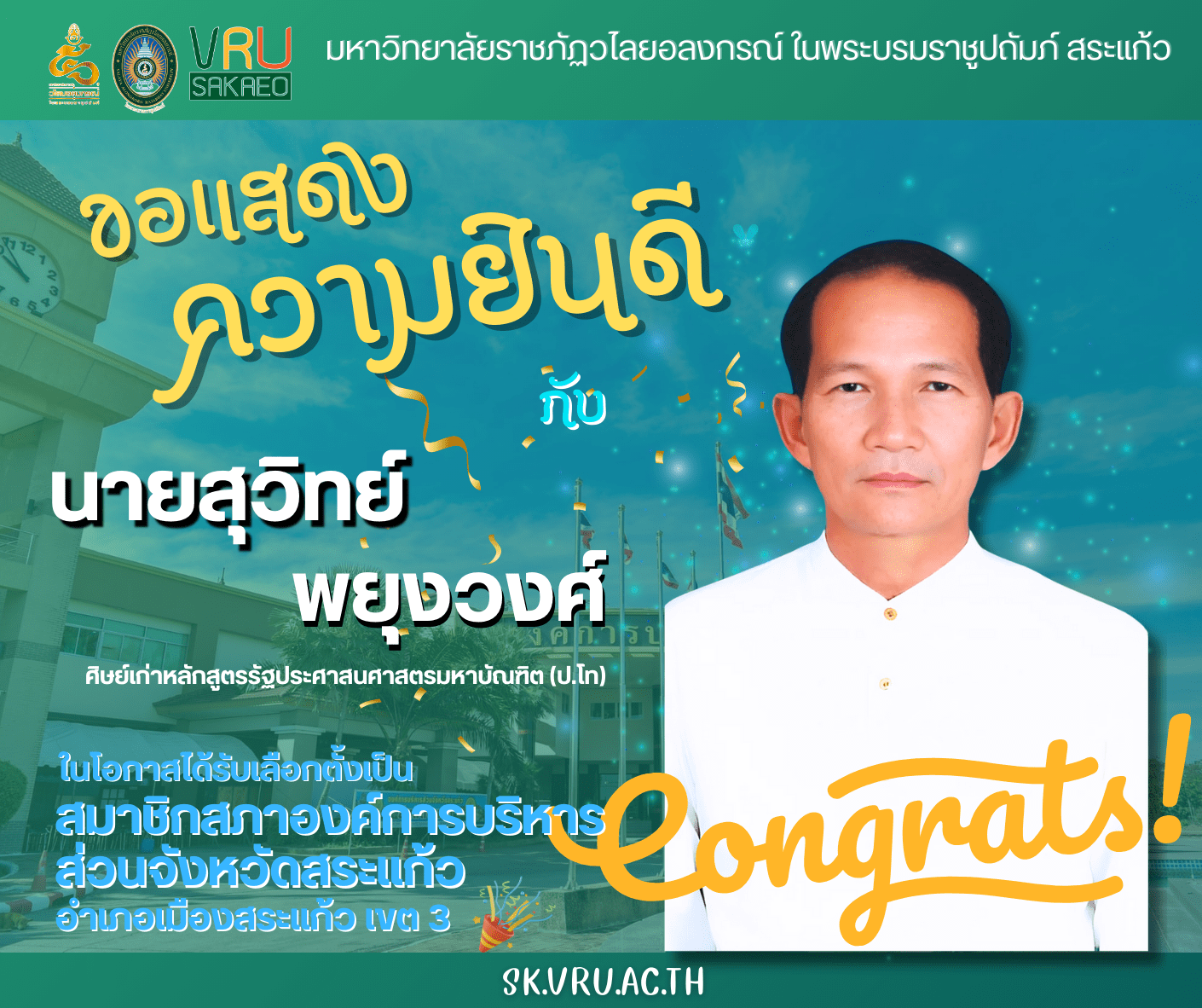 มหาวิทยาลัยราชภัฏวไลยอลงกรณ์ ในพระบรมราชูปถัมภ์ สระแก้ว ขอแสดงความยินดี กับศิษย์เก่า นโอกาสได้รับเลือกตั้งเป็นสมาชิกสภาองค์การบริหารส่วนจังหวัดสระแก้ว 4 เขตข่าวประชาสัมพันธ์ / 19 กุมภาพันธ์ 2025 มหาวิทยาลัยราชภัฏวไลยอลงกรณ์ ในพระบรมราชูปถัมภ์ สระแก้ว ขอแสดงความยินดี กับ นายสุวิทย์ พยุงวงศ์ ศิษย์เก่าหลักสูตรรัฐประศาสนศาสตรมหาบัณฑิต (ป.โท) ในโอกาสได้รับเลือกตั้งเป็นสมาชิกสภาองค์การบริหารส่วนจังหวัดสระแก้ว อำเภอเมืองสระแก้ว เขต 3 นายพิเชษฐ เที่ยงธรรม ศิษย์เก่าหลักสูตรรัฐประศาสนศาสตรมหาบัณฑิต (ป.โท) และหลักสูตรหลักสูตรบริหารธุรกิจบัณฑิต สาขาวิชาการจัดการทั่วไป ในโอกาสได้รับเลือกตั้งเป็นสมาชิกสภาองค์การบริหารส่วนจังหวัดสระแก้ว อำเภอเมืองสระแก้ว เขต 4 นายอัครเดช ชาญชัย ศิษย์เก่าหลักสูตรหลักสูตรบริหารธุรกิจบัณฑิต สาขาวิชาการจัดการทั่วไป ในโอกาสได้รับเลือกตั้งเป็นสมาชิกสภาองค์การบริหารส่วนจังหวัดสระแก้ว อำเภอเมืองสระแก้ว เขต 6 นายรังสรรค์ จัดพล ศิษย์เก่าหลักสูตรรัฐประศาสนศาสตรบัณฑิต สาขาวิชาการปกครองท้องถิ่น ในโอกาสได้รับเลือกตั้งเป็นสมาชิกสภาองค์การบริหารส่วนจังหวัดสระแก้ว อำเภออรัญประเทศ เขต 5
