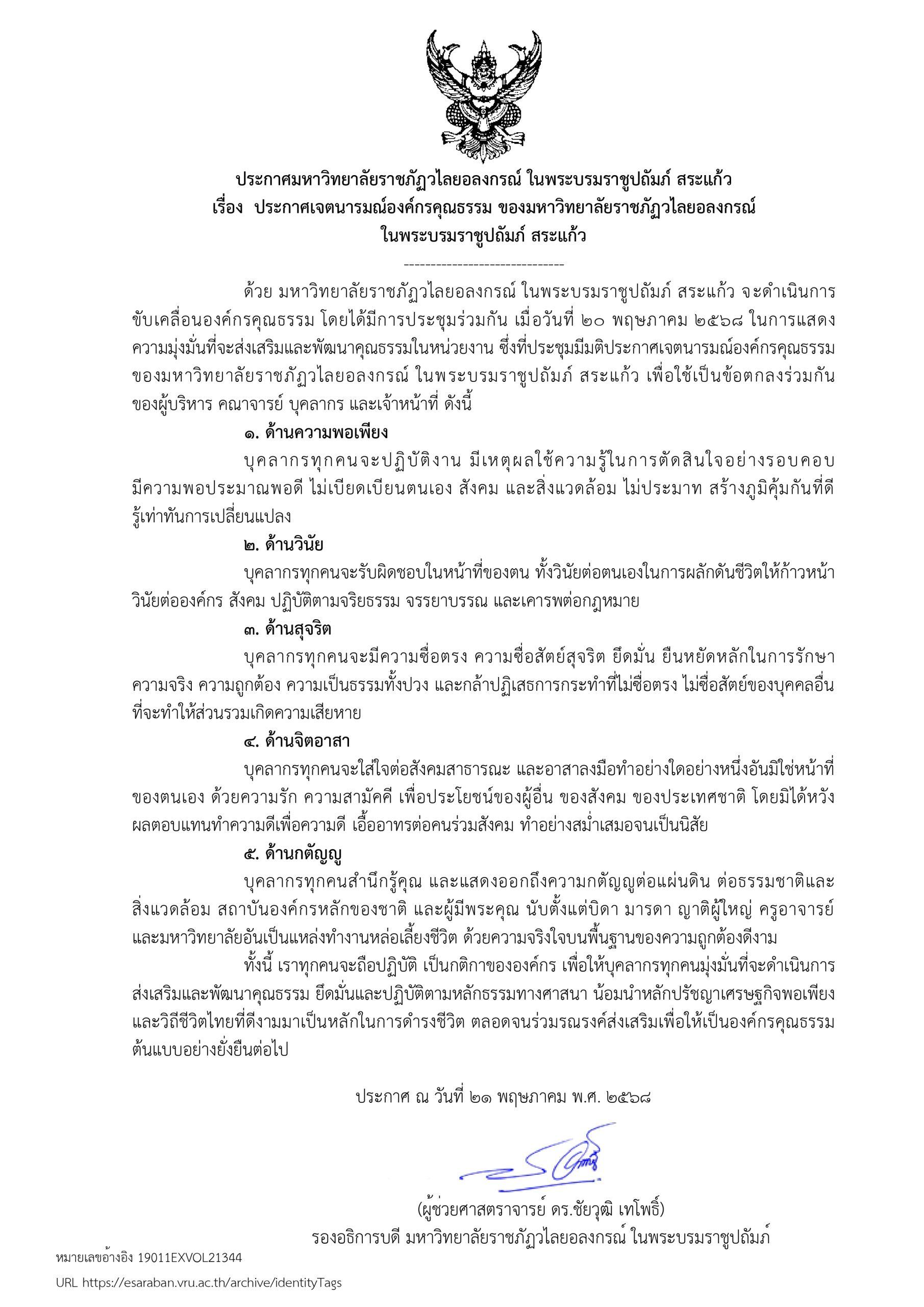 ประกาศ มรวอ. สระแก้ว เรื่อง ประกาศเจตนารมณ์องค์กรคุณธรรม ของมหาวิทยาลัยราชภัฏวไลยอลงกรณ์ ในพระบรมราชูปถัมภ์ สระแก้ว